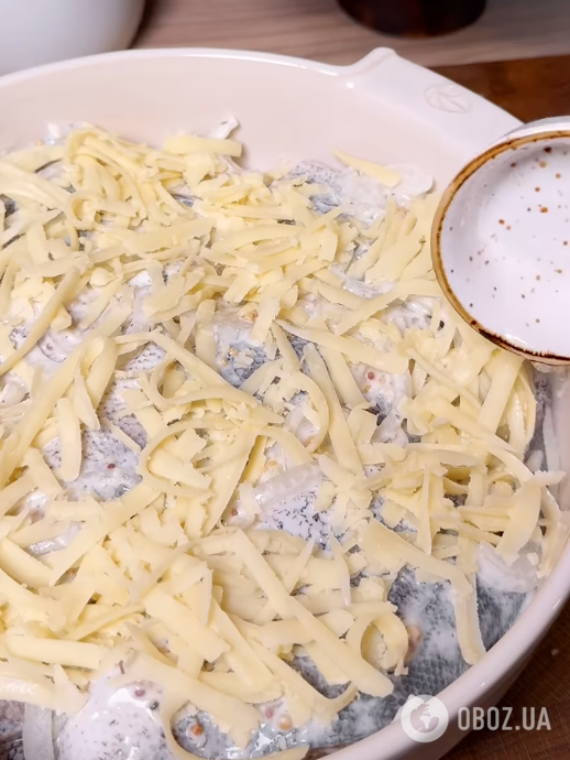 3. Форму для запекания смазать маслом и выложить рыбу с луком, влить воду, натереть сыр и выложить сверху на рыбу. Накрываем фольгой и отправляем в разогретую до 180С духовку на 20 минут.