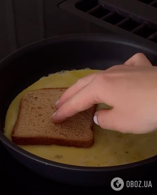 2. Підсмажте хліб, зверху вилийте яєчну суміш, підсмажте і переверніть.