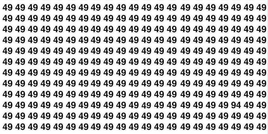 На запропонованому зображенні ви бачите кілька рядів із числа 49. Куди не кинь погляд, всюди натрапиш на скупчення цих чисел. У подібних ситуаціях наш мозок робить висновок, що зображення містить тільки цифри 49 без жодних винятків. Але на те це і головоломка, що насправді у ній міститься виняток і його потрібно відшукати. Виняток цей – це цифра 94. На її пошуки автори головоломки відводять 20 секунд.